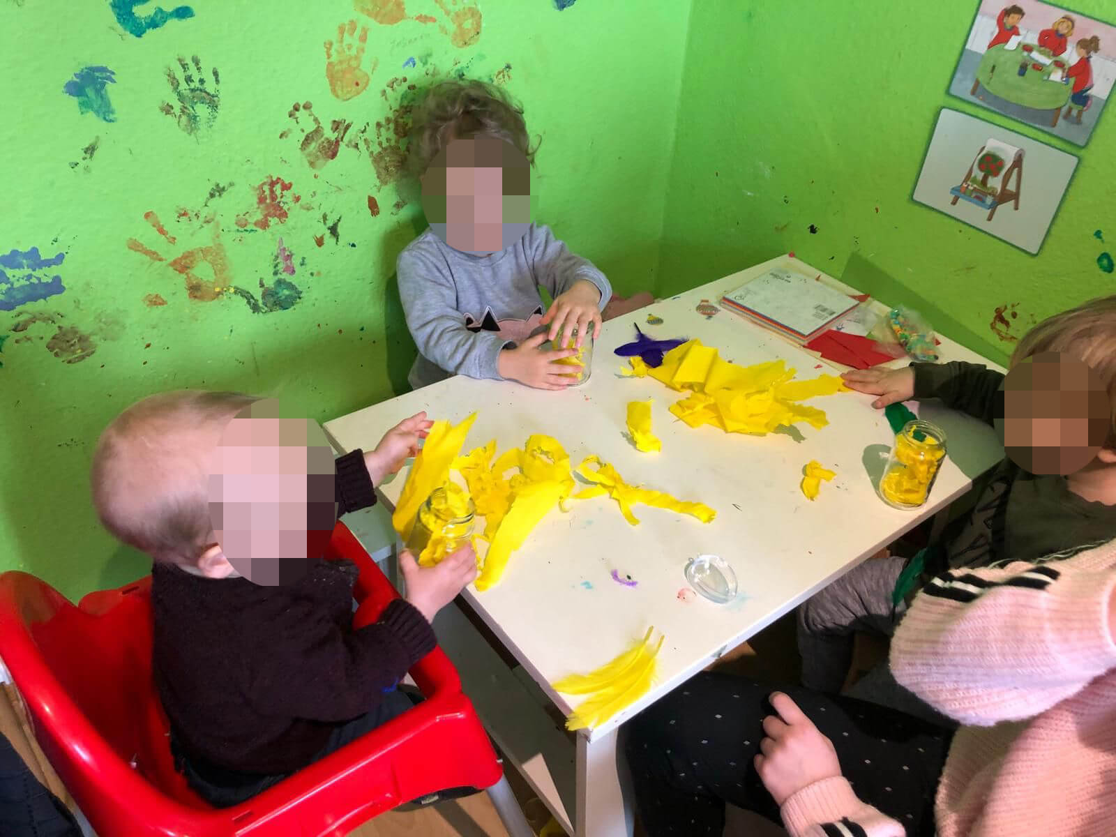Die Krabbelmäuse haben fleißig gebastelt, gemalt und getupft. Zum Abschluss gab es dieses Jahr ein kleines coronakonformes Ostereiersuchen im Garten. Jeden Familie konnte bei Kaffee und Kuchen mit ihrem Kind ein Nest und kleine Überraschungen suchen. So kamen wir auch wieder mehr in den Austausch.